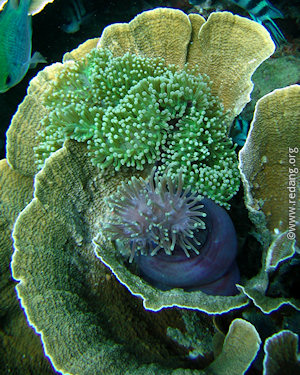 Reefs are built by hard corals such as the lettuce coral shown here. Soft corals like the anemone growing inside the lettuce coral do not build reefs.