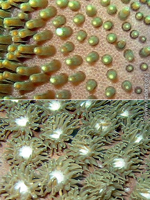 Leather coral polyps with retracted tentacles (top) and with tentacles extended.